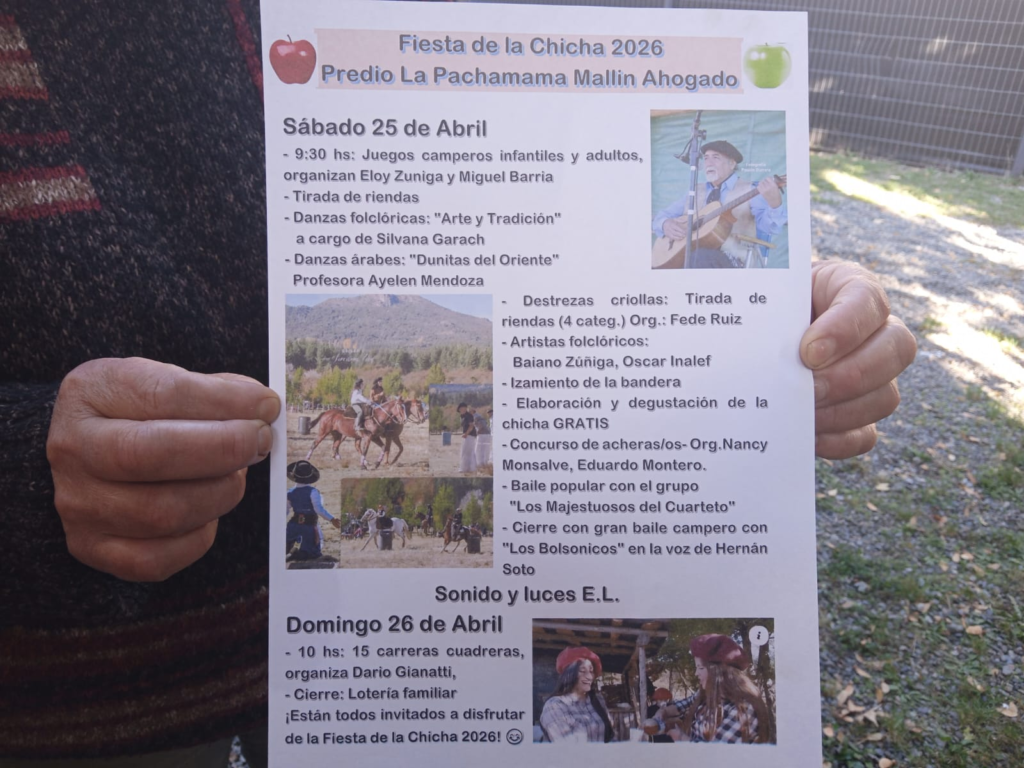 La Fiesta de la Chicha 2026 ya tiene fechas confirmadas en Mallín Ahogado y se desarrollará el sábado 25 de abril y el domingo 26 de abril en el Predio La Pachamama. La propuesta incluirá juegos camperos, música en vivo y actividades tradicionales vinculadas al ámbito rural.